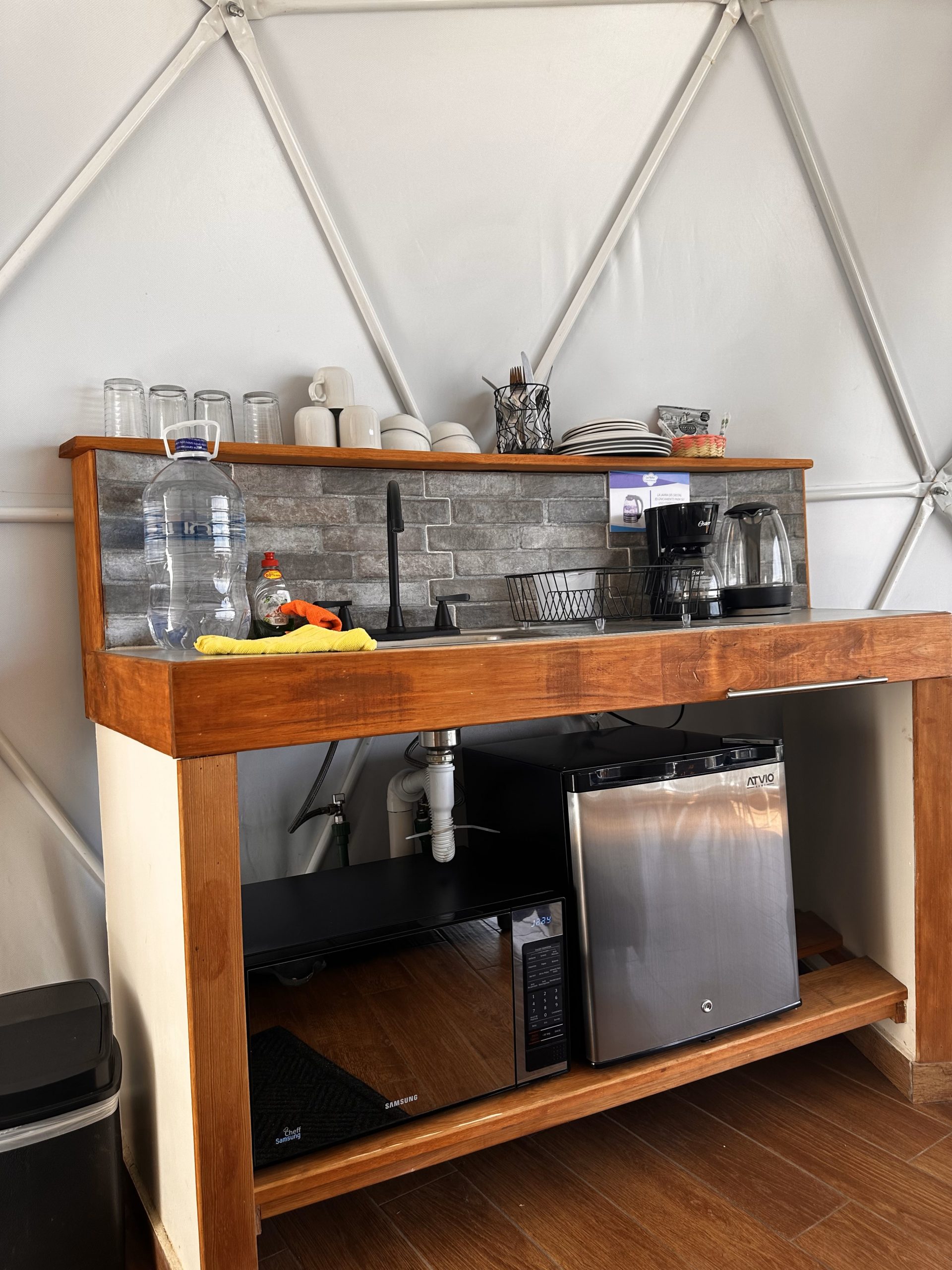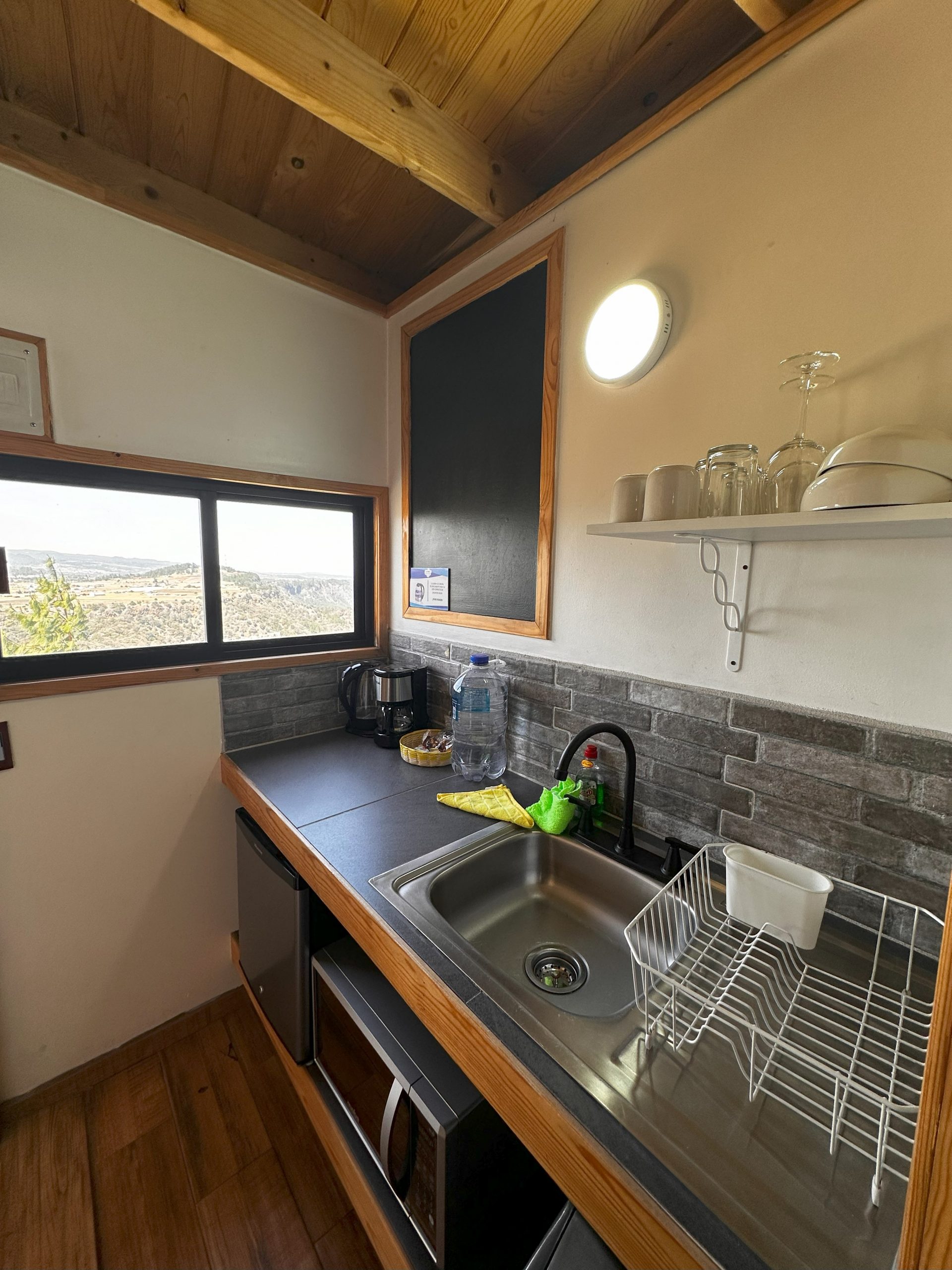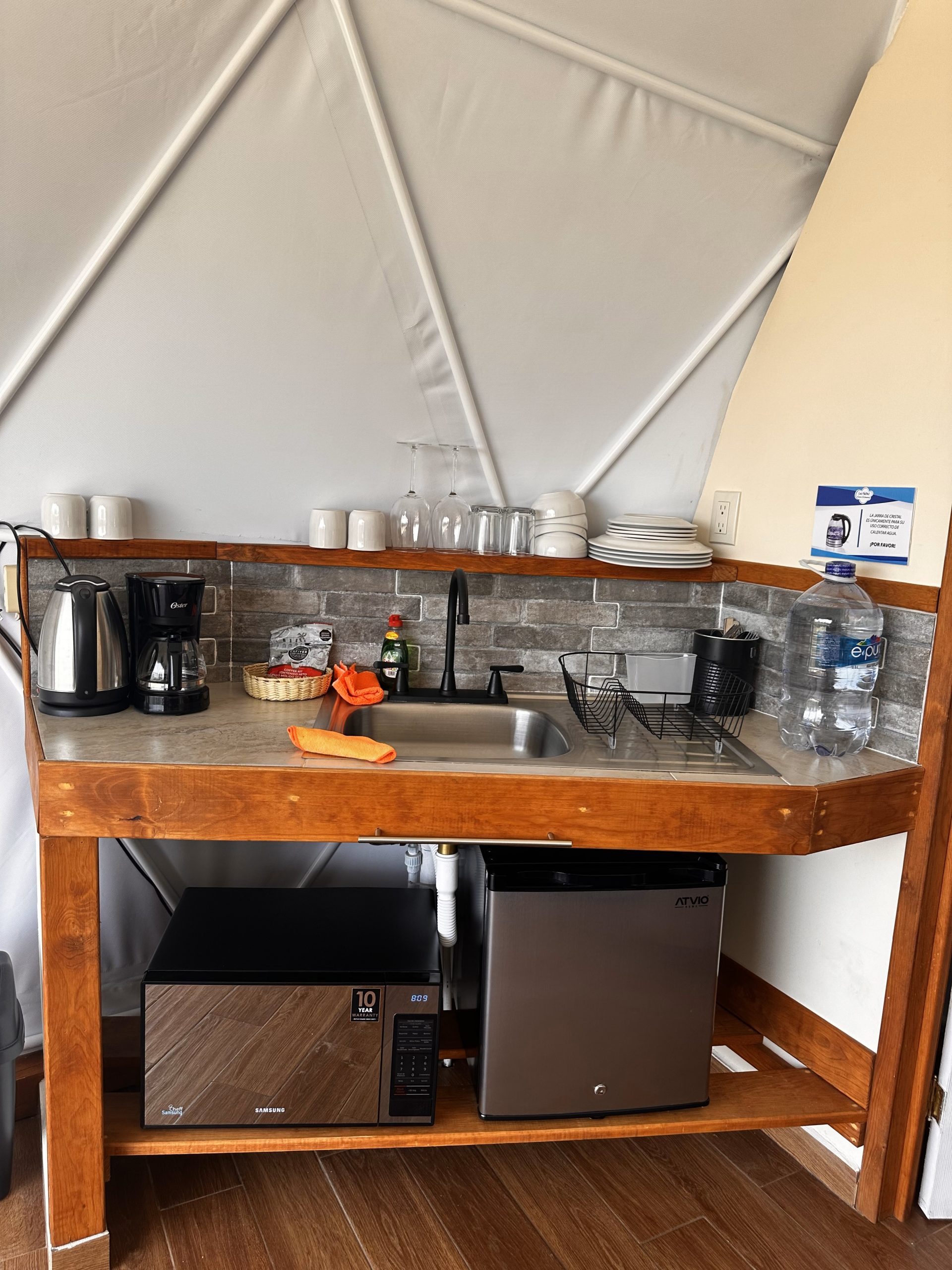 - Cocina con microondas, cafetera, jarra eléctrica para calentar agua, platos, tazas, copas y utensilios